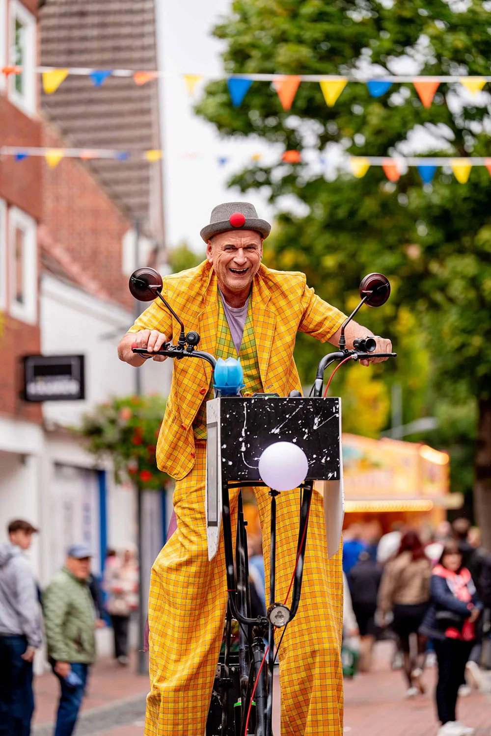 Clown Georg spielt mit dem, was gerade da ist – mit Menschen, mit Momenten, mit kleinen Missgeschicken – und macht daraus große Unterhaltung. Dabei entsteht immer ein echtes Miteinander, das lange in Erinnerung bleibt.